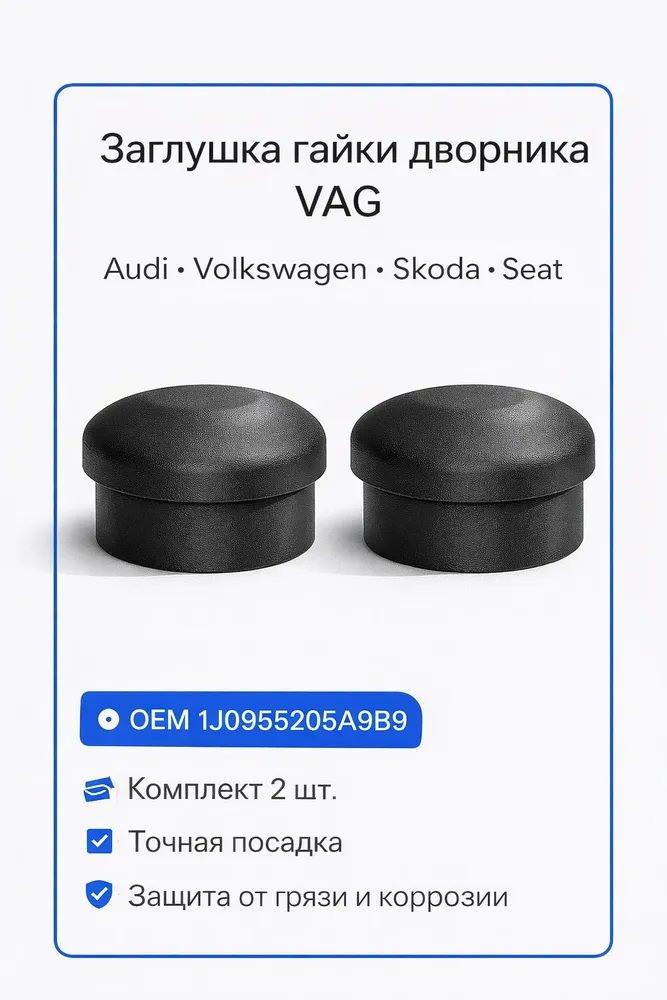 Заглушка гайки дворника VAG Audi VW Skoda Seat 2 штЗаглушки гайки стеклоочистителя VAG — комплект 2 штуки, предназначены для закрытия гайки крепления дворника на автомобилях OEM: 1J0955205A9B9 Подходит для автомобилей VAG: Audi: A1…