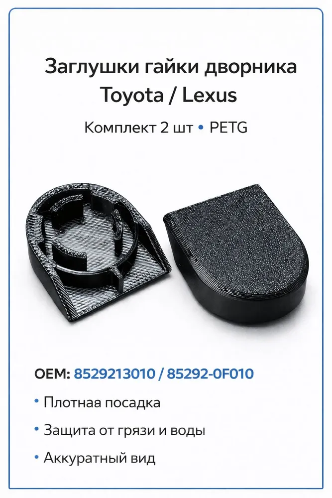 Заглушки гайки дворника Toyota Lexus, комплект 2 шт, PETGНазначение Заглушки гайки стеклоочистителя предназначены для защиты крепления поводка дворника от влаги, грязи и реагентов.